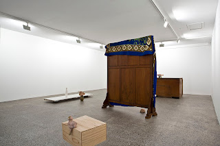 It’s in the Project Space that is separate from the main suite of Te Tuhi galleries (closer to the café) that Rachel Walters has a very entertaining installation, one featuring her interest in ceramics and kitsch. Neither of these subjects I find particularly enthralling but with Walters, her essential characteristics are humour and inventiveness. Lots of artists make exhibitions out of found objects resulting in lots of artists being boringly predictable. This show though has an exhilarating freshness. Its static wooden and china objects keep providing surprises.